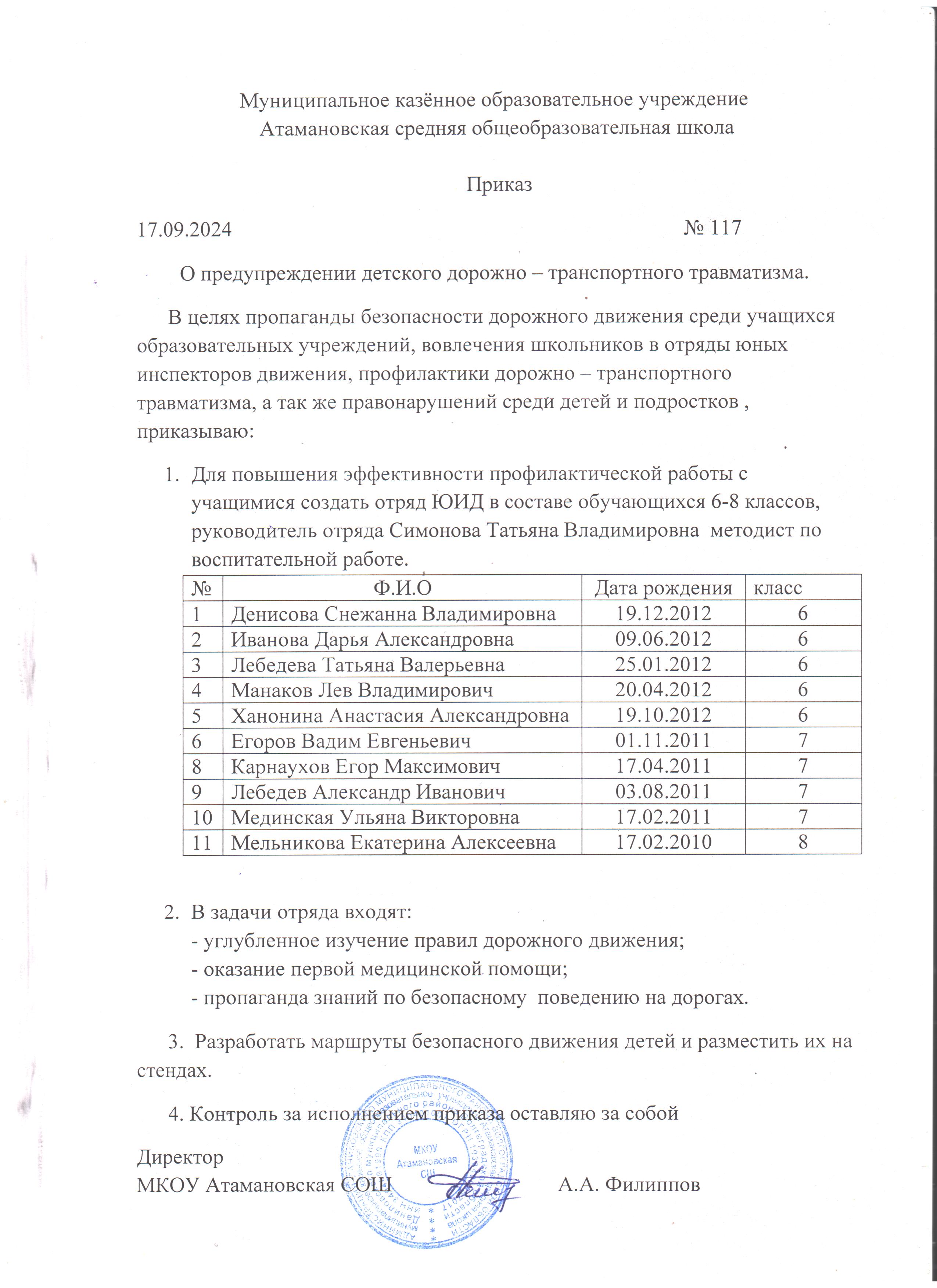 от 17.09.2024 г № 117 о создании отряда ЮИД