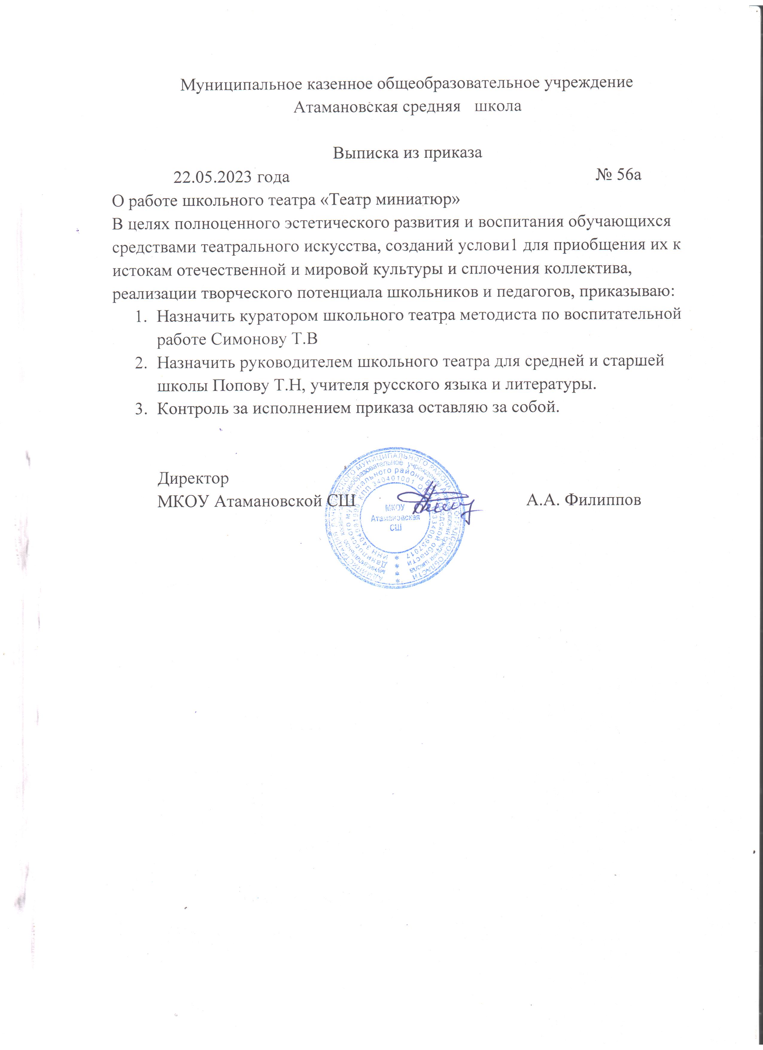 Приказ " О работе школьного театра "Театр миниатюр"" от 22.05.2023 г № 56а